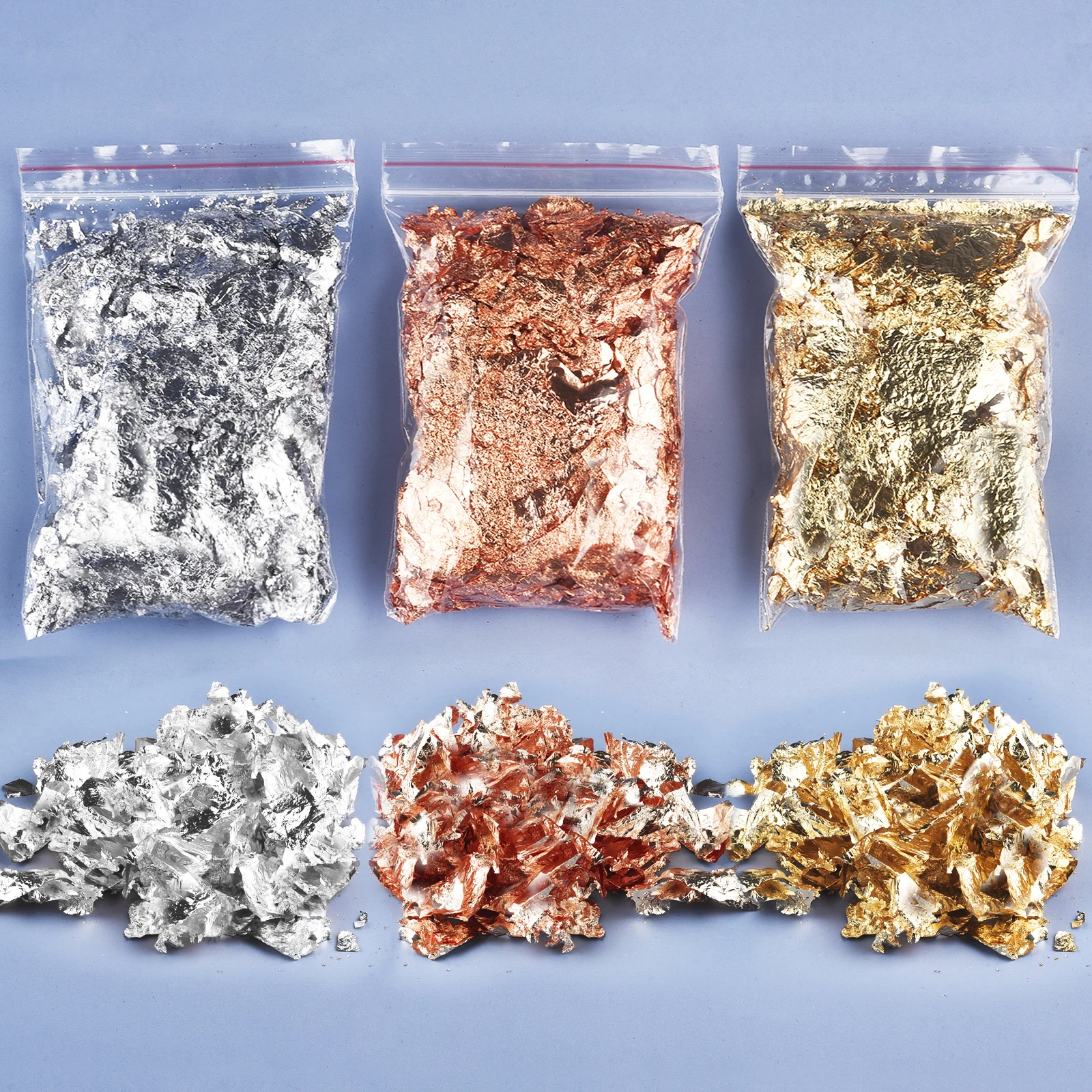 Add a luxurious metallic shine to your projects with these Imitation Gold, Silver, and Copper Foil Sequins Flakes. Available in 1g, 2g, 3g, 5g, and 10g, these shiny foil leaf flakes and sheets are perfect for gilding, epoxy resin art, nail art, painting, and DIY crafts. Lightweight and easy to apply, they create a brilliant reflective finish on a variety of surfaces. Ideal for artists, crafters, nail technicians, and DIY hobbyists, these foil flakes elevate any design with a rich, metallic touch.