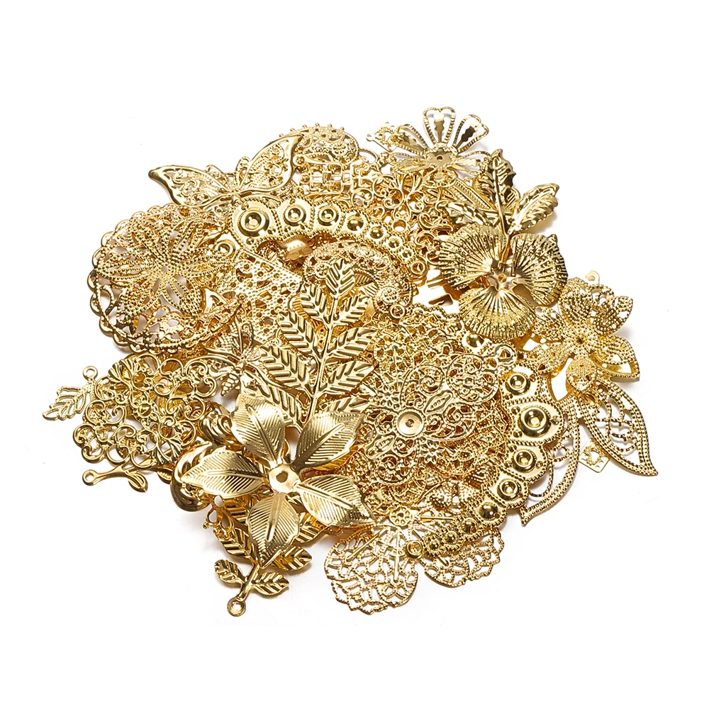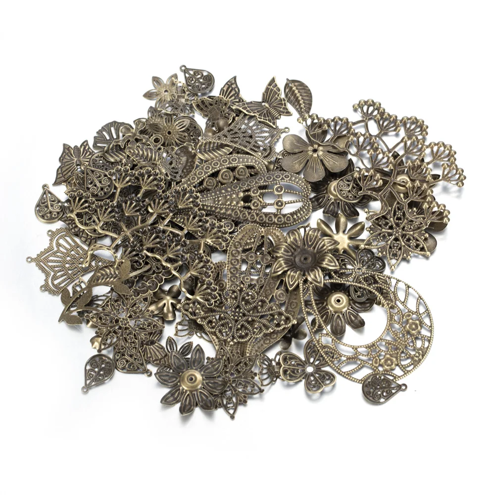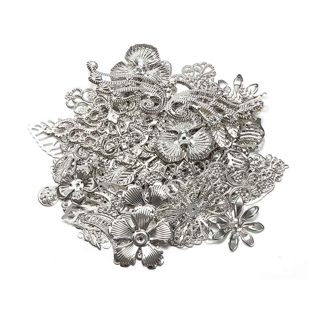 Enhance your jewelry and craft projects with this 50g Mixed Metal Pendants & Filigree Flower Wraps Set. This versatile collection includes connectors, charms, bead end caps, and decorative embellishments—perfect for bracelets, necklaces, scrapbooking, and DIY jewelry making.