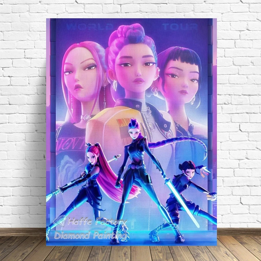Bring your favorite characters to life with this Kpop Demon-Hunters Anime Diamond Painting Kit. Featuring 5D DIY cross-stitch style mosaic patterns, this kit allows you to create a vibrant artwork of Rumi, Mira, Zoey, and other cartoon girl characters.