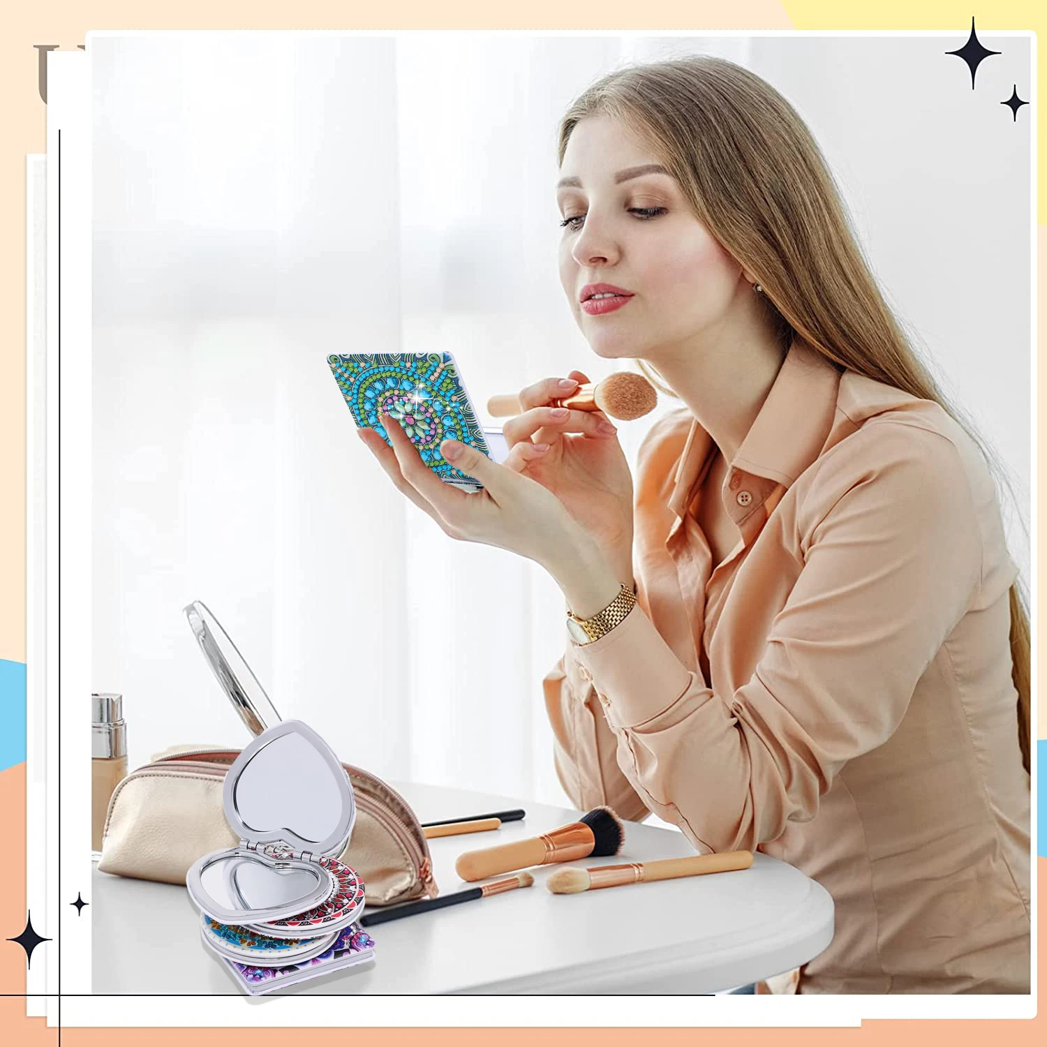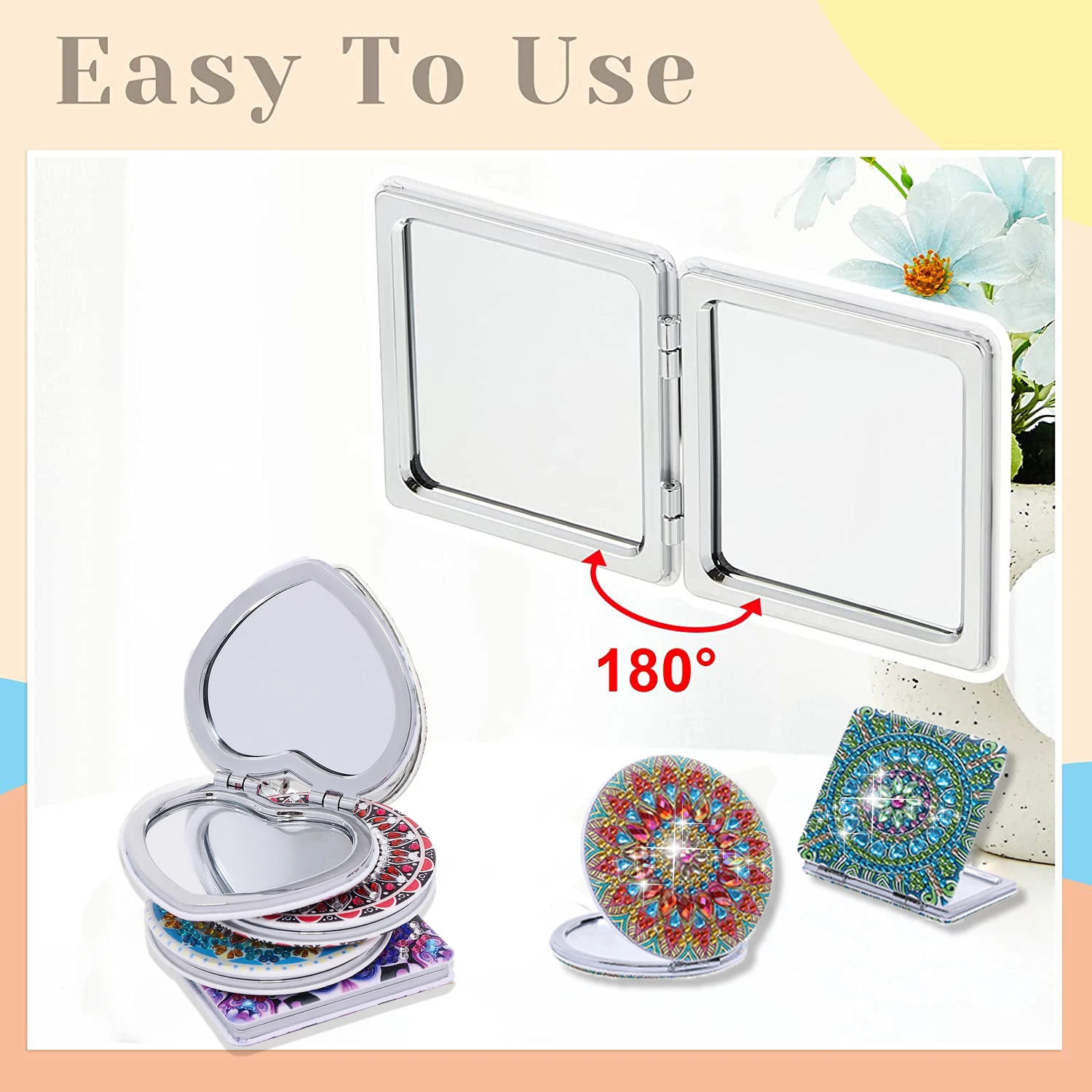 Create a sparkling, personalized accessory with this DIY Mandala Diamond Art Compact Mirror Kit. Featuring a portable, folding leather design, this pocket mirror can be decorated with diamond painting rhinestones to create a stunning, customized Mandala pattern.
