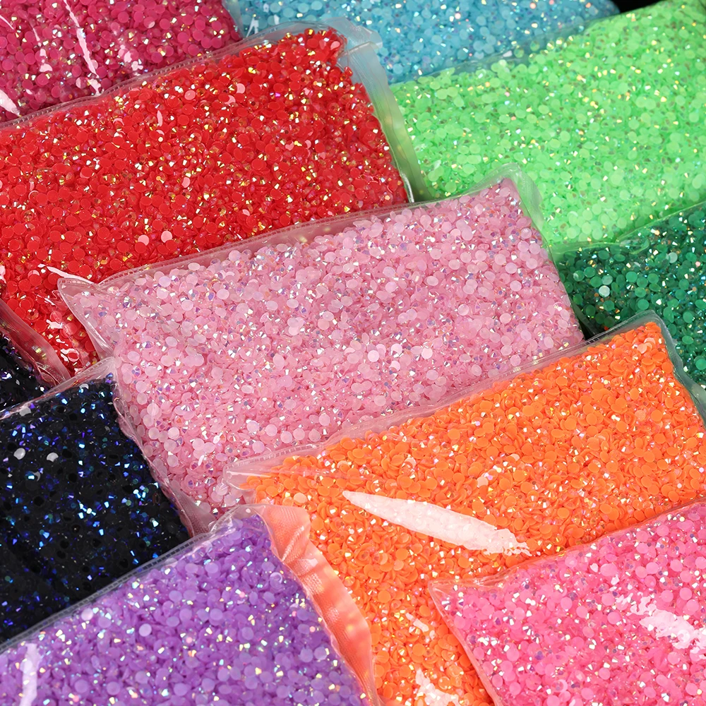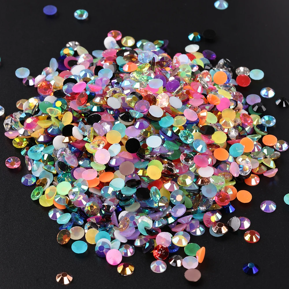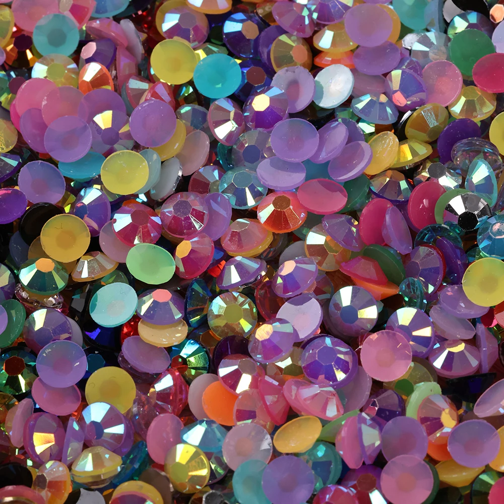 Bring brilliant sparkle to your creations with these Wholesale Bulk Resin Rhinestones featuring vibrant jelly colors and transparent AB (Aurora Borealis) finish. Designed with precision-cut facets and flat backs, these lightweight gems are easy to apply and reflect light beautifully. Available in 2mm, 3mm, 4mm, 5mm, and 6mm, they are perfect for nail art, garment decoration, phone cases, resin crafts, and DIY embellishments. Ideal for nail technicians, fashion designers, and craft enthusiasts, these rhinestones deliver eye-catching shine at great bulk value.